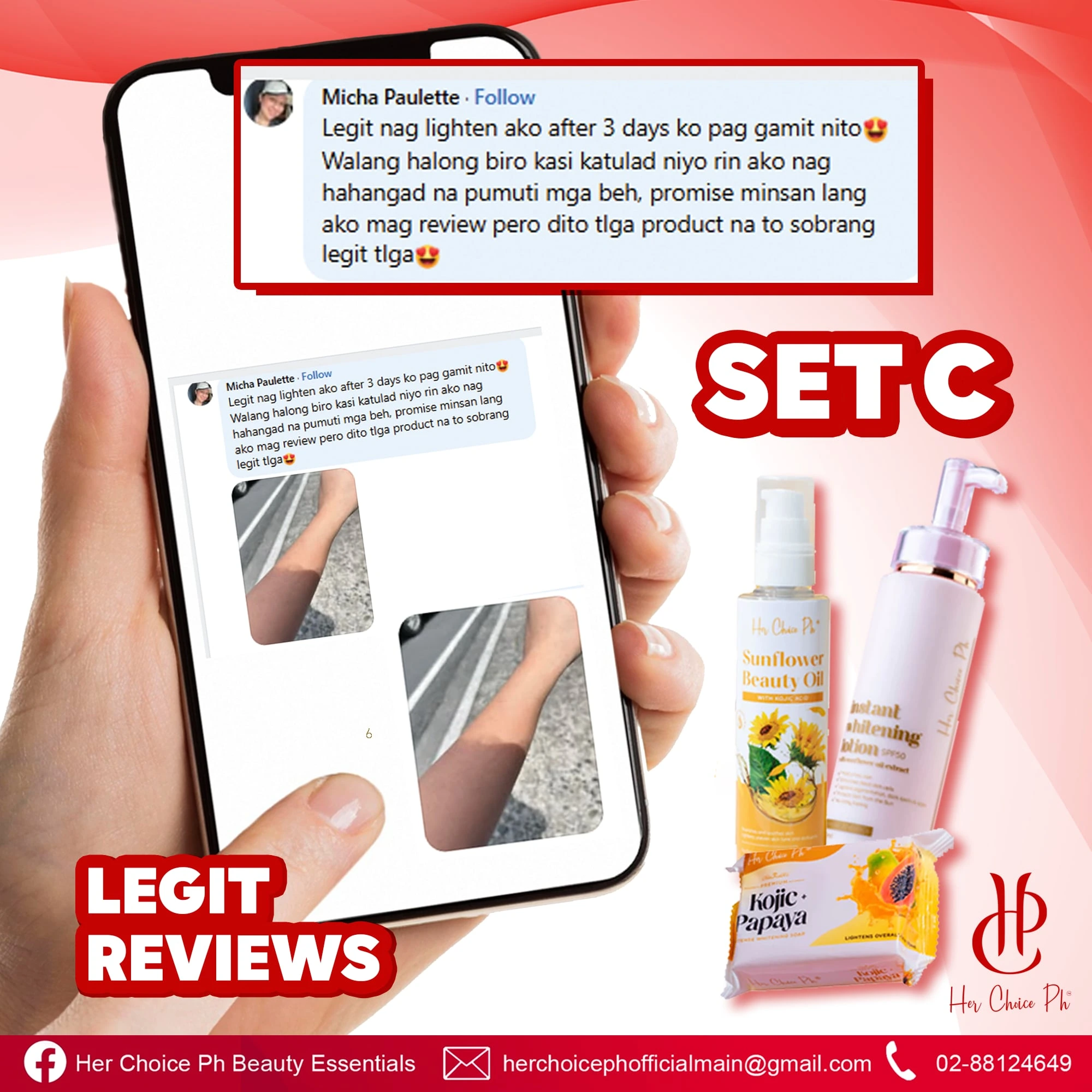 Bagama’t primarily formulated ito para sa katawan, maraming customers ang gumagamit din ng Set-C sa face. For best results, gumamit din ng separate facial sunscreen para sa mas protektadong balat.